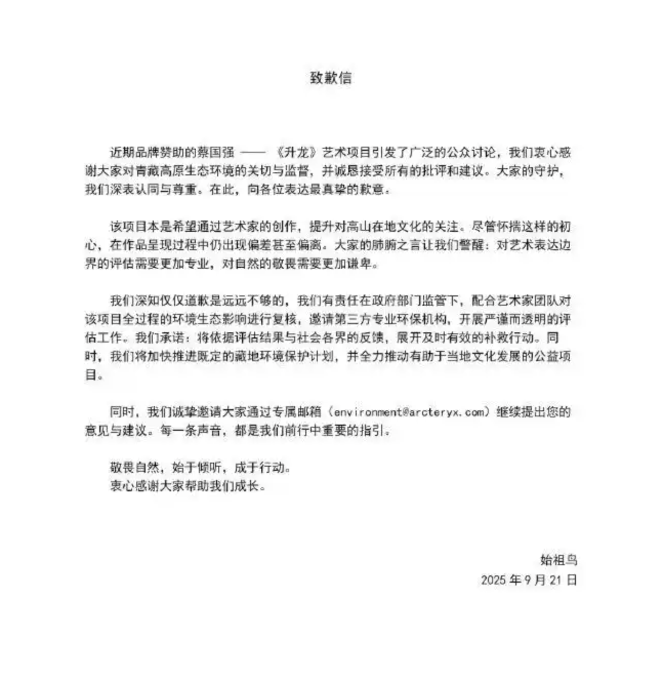 对于“升龙”烟花表演,始祖鸟在道歉信中表示,在对艺术表达边界评估要更专业、对自然要更谦卑,承诺在政府监管下,配合团队复核项目生态影响,邀第三方评估并依结果补救,同时推进藏地环保计划与文化公益项目。蔡国强工作室同日说明,虚心接受批评,将配合评估,如有影响会尽力补救。
